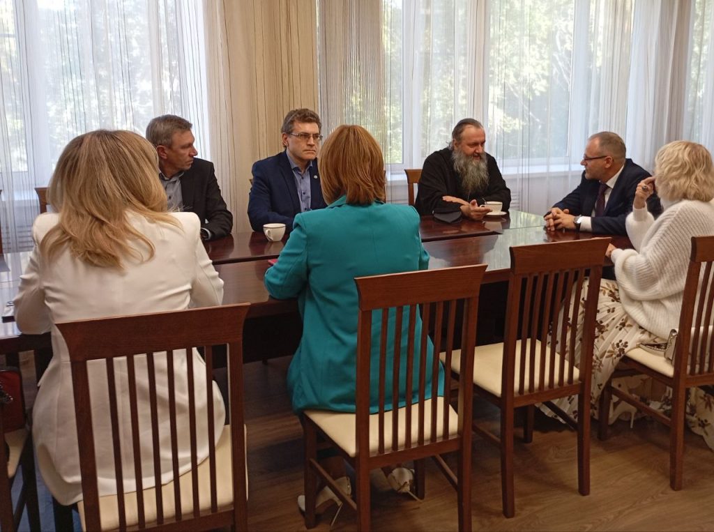 Митрополит Феодосий встретился с ректором Самарского института развития образования И. Н. Минаевым и представителями педагогического сообщества города Самары. В рамках знакомства с новым управляющим Самарской епархией, были обсуждены многолетние практики успешного взаимодействия Церкви и вуза: повышение квалификации педагогов духовно-нравственного направления, педагогический лагерь в Винновском мужском монастыре, учительские Кирилло — Мефодиевские чтения, взаимодействие с РУМО и проч. Участники встречи выразили согласное намерение продолжать и наращивать направления соработничества. Владыка тепло поздравил педагогов с наступающим Днём учителя и передал в дар ИРО образ Спаса Звенигородского.